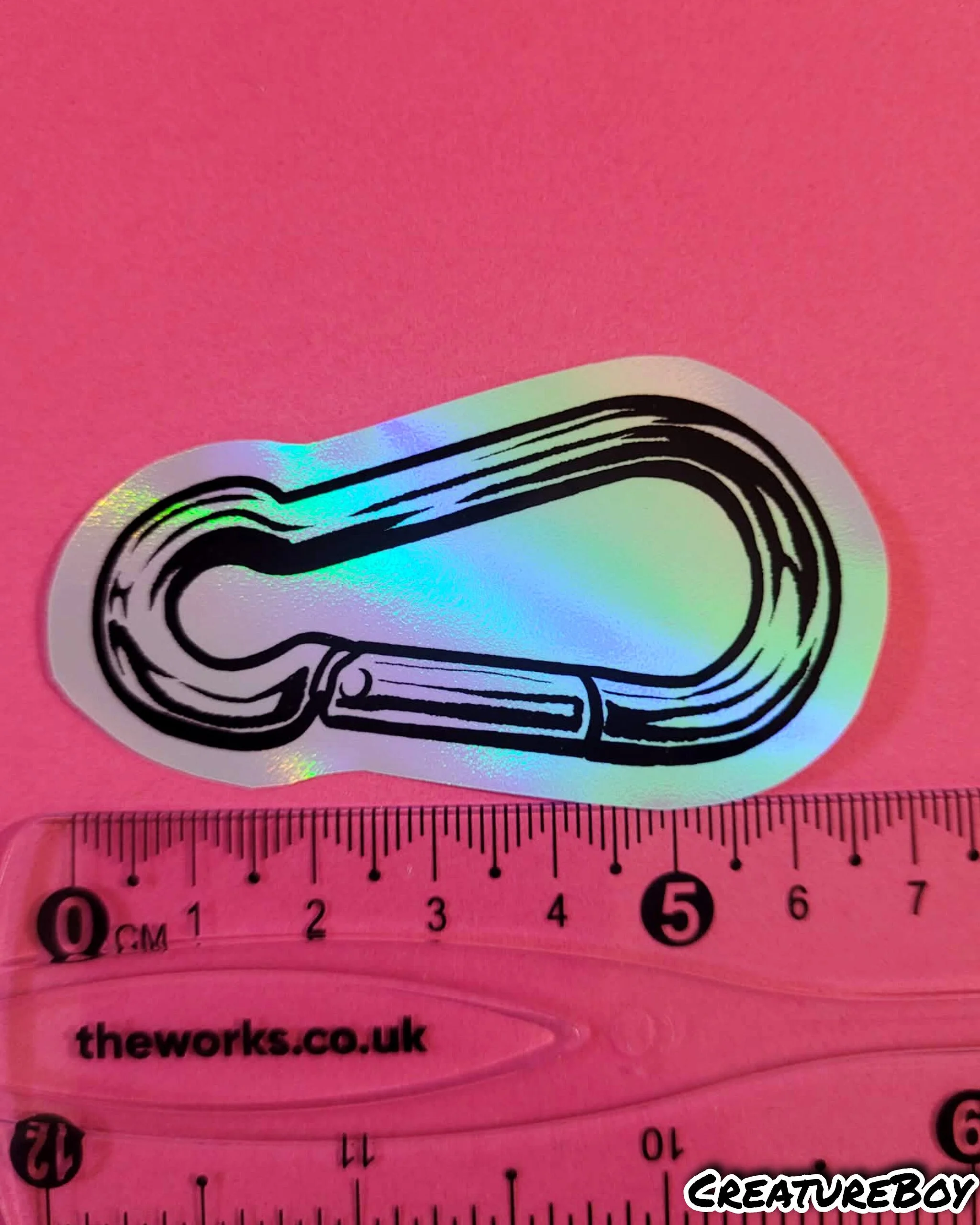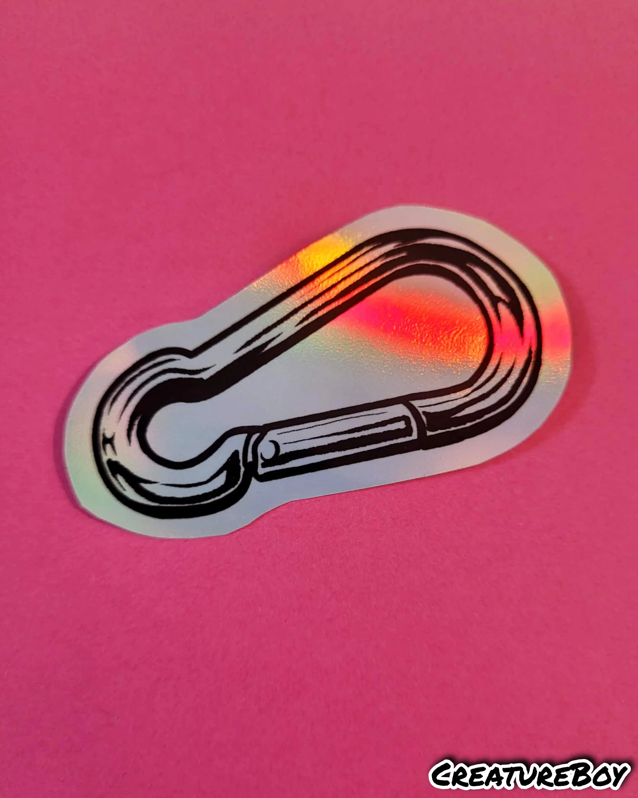 A classic style carabiner as a shiny, holographic sticker.